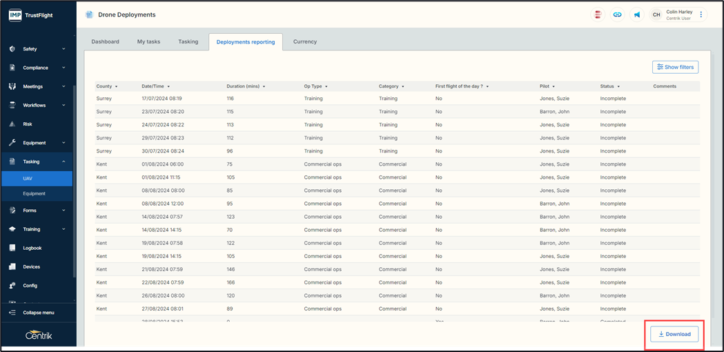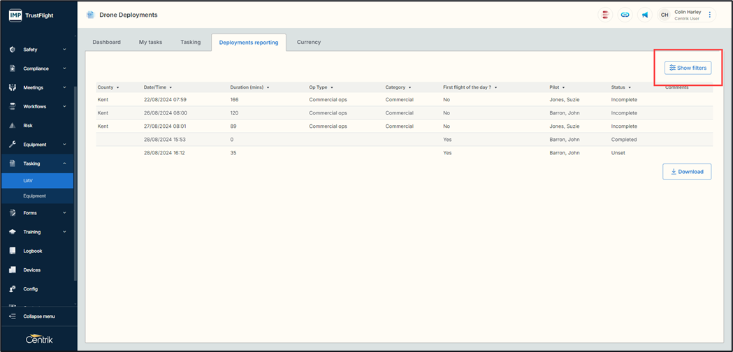 Once any filter options have been selected clicking on the ‘Apply filter’ button will display the required results. There is a download function available too.