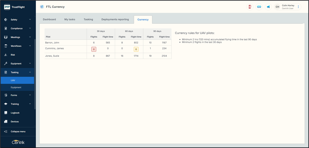 The currency page provides an overview of all pilot data over the last 90 days.