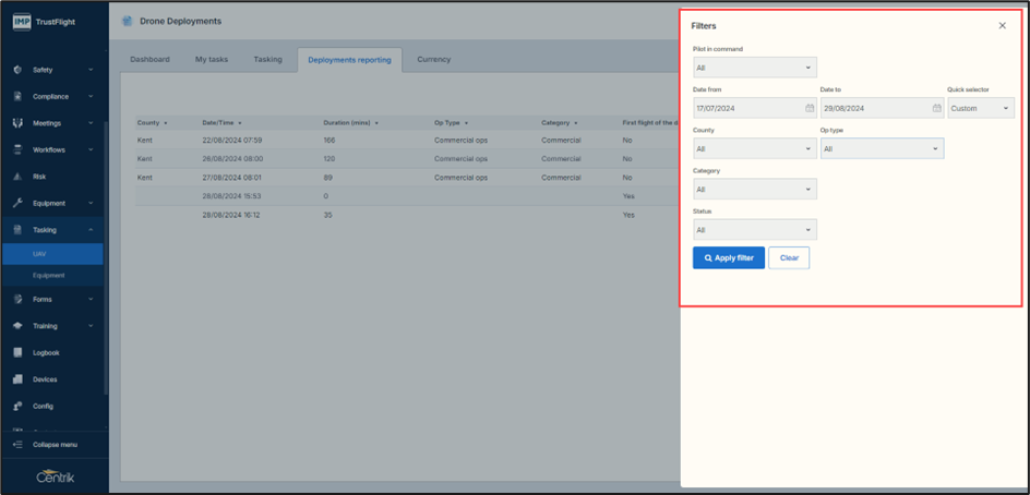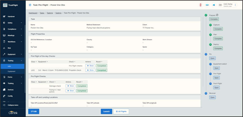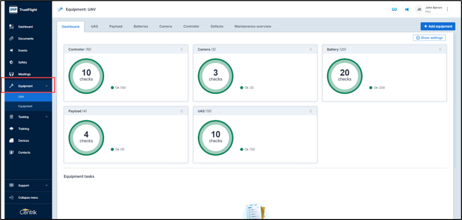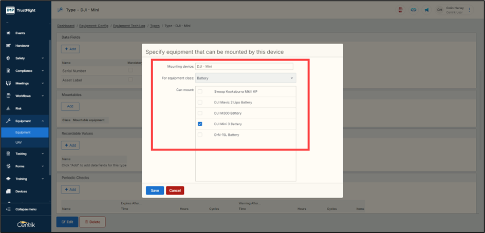 As in previous versions of Centrik UAVs are added to the system through the equipment module. Enabling equipment to be used within tasks and to use the mountables option is achieved through the class configuration of equipment. This hasn’t changed however the module is accessed from the left navigation page.