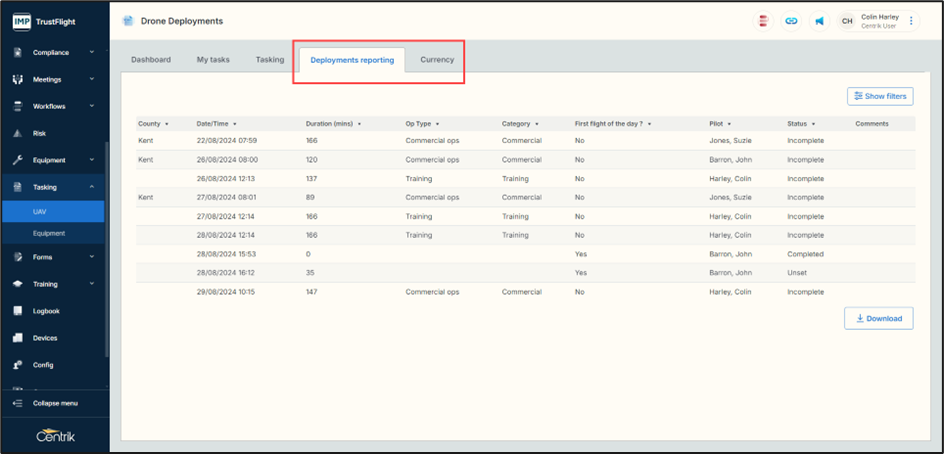 Finally, the Deployments reporting, currency pages and Logbook areas have been refreshed in look and feel, featuring new search functions, clearer visuals and downloading capabilities.
