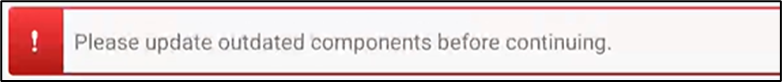- Out of date items prompts with a red exclamation mark, stating "Please update outdated components before continuing."
