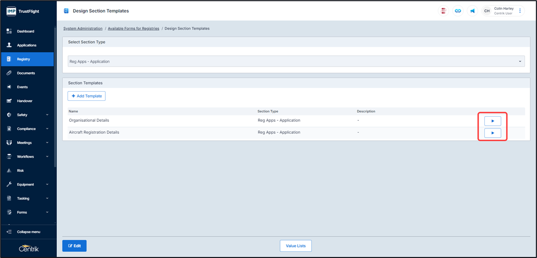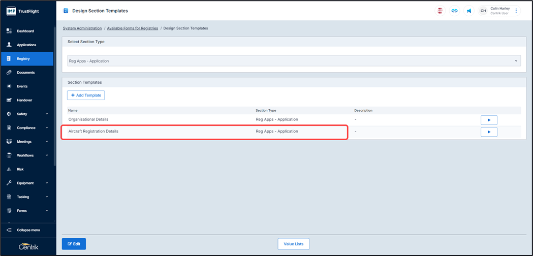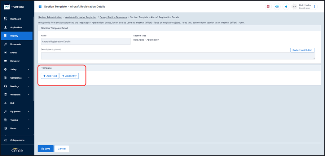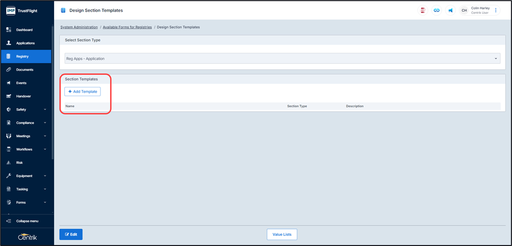 Note, you can add as many sections as is required, clicking on the ‘Add Template’ button adds in additional sections, each additional section requires its own name.