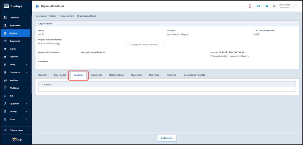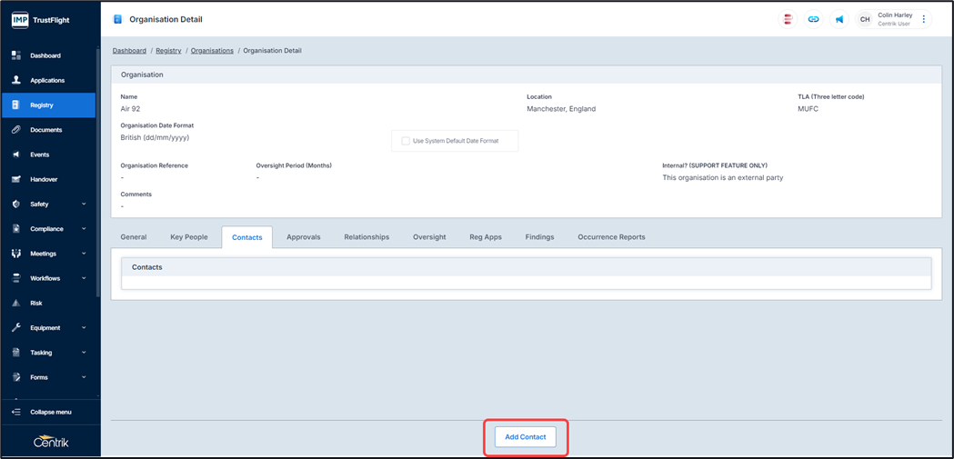9. Select the ‘Contact tab, here can enter in an individual from the added organisation as a contact or as a contact with system access. If given system access and a finding is raised during an audit this contact can respond with a corrective action plan, and root cause analysis directly in Centrik.
