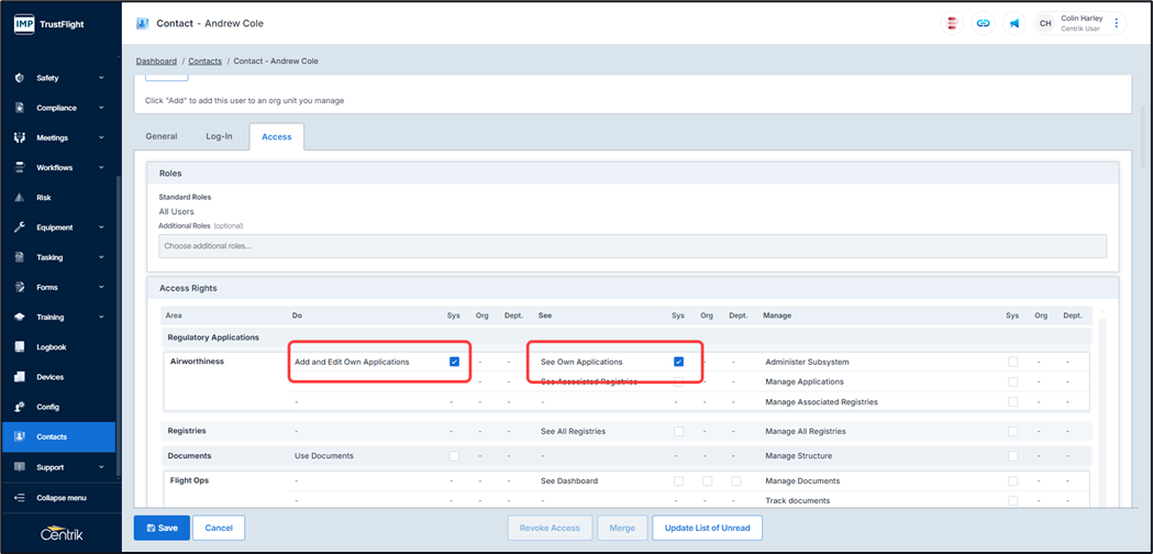18. Select the checkboxes that will enable system access to this user in the appropriate modules, the access right to Add and edit Own Applications and to See Applications is required for this contact / organisation to submit applications