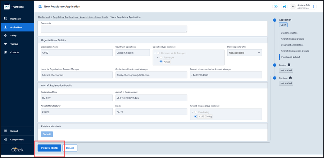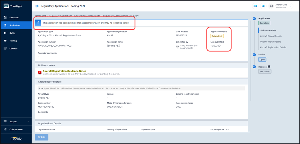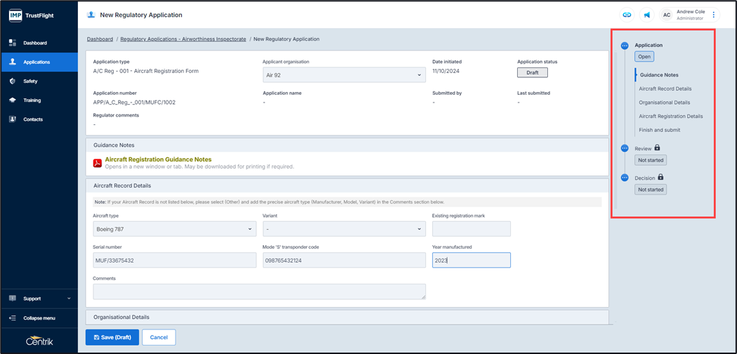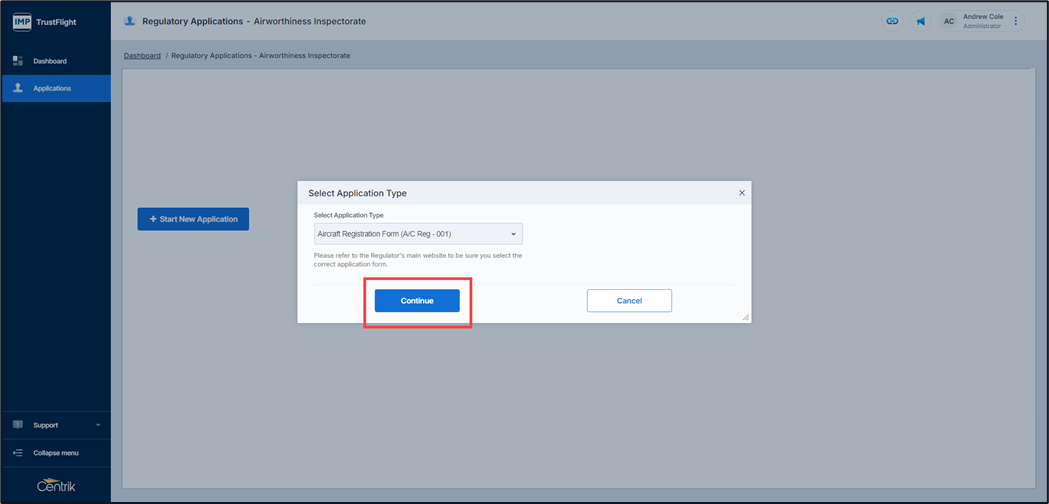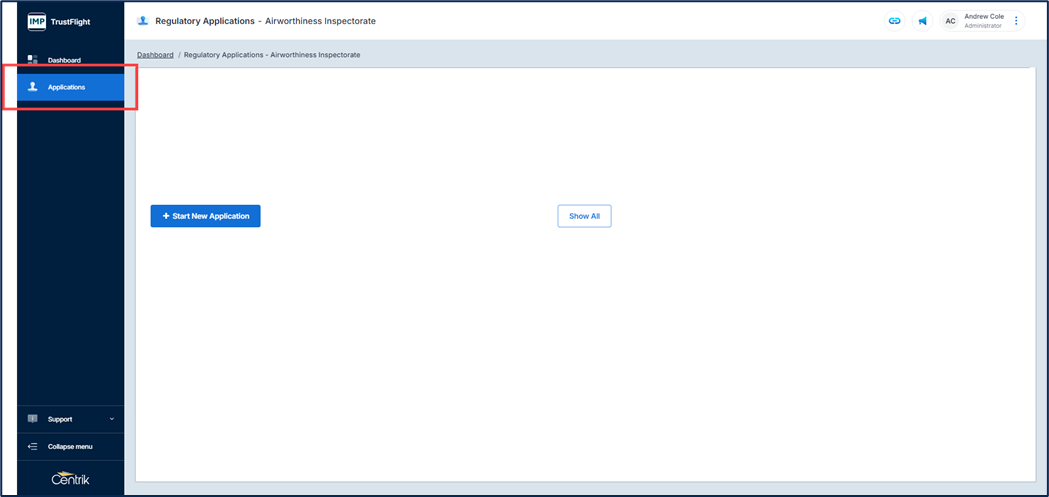 Upon logging into Centrik the organisation making the application proceeds to the Applications module, its possible that this is the only module that they have access to.