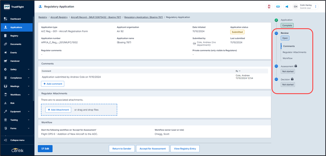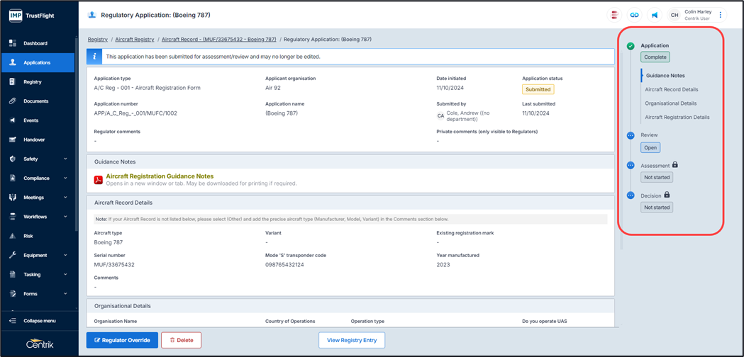 The phases of the Application are displayed on the right of the screen, the Application phase has been completed, the Review phase is next.