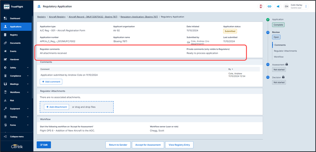 Regulator Comments – Comments regarding this application, viewable by the applicant and the Regulator