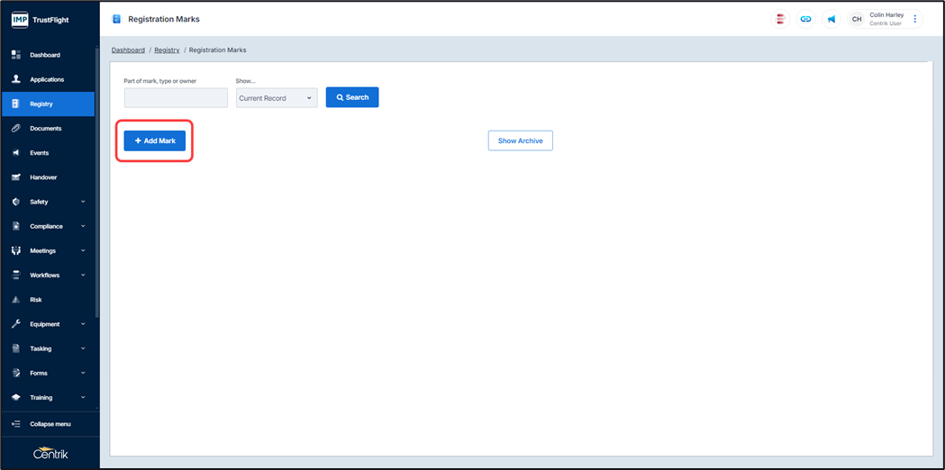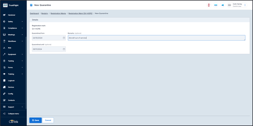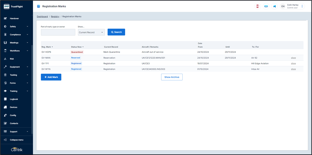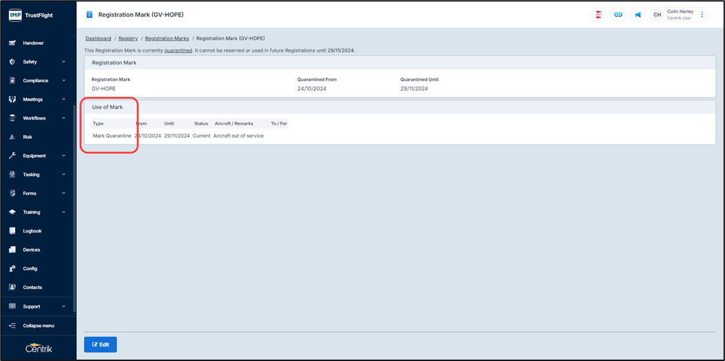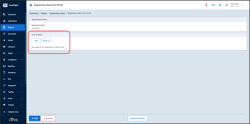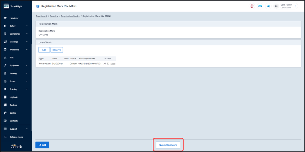 Accessing the aircraft and clicking on the ‘Quarantine Mark’ button will restrict the registration mark from use.