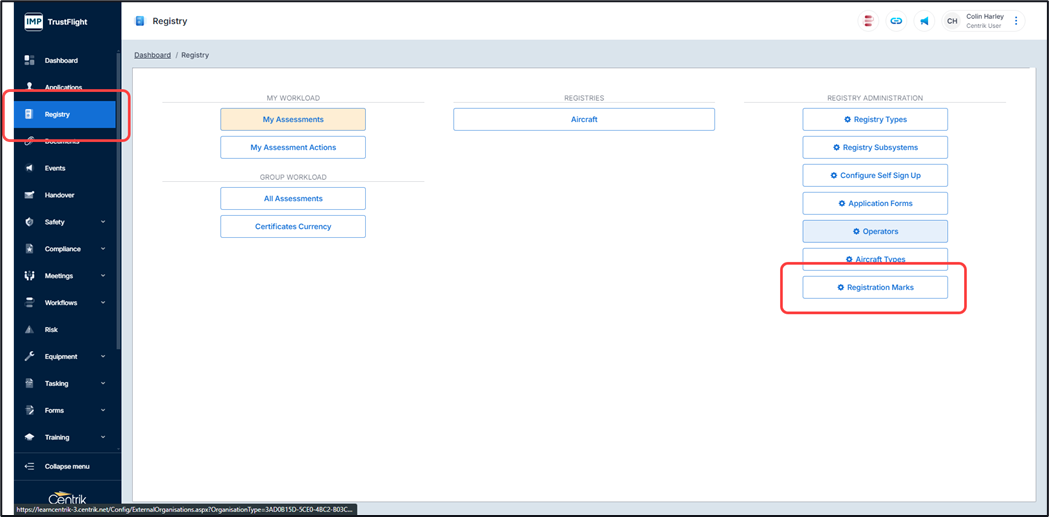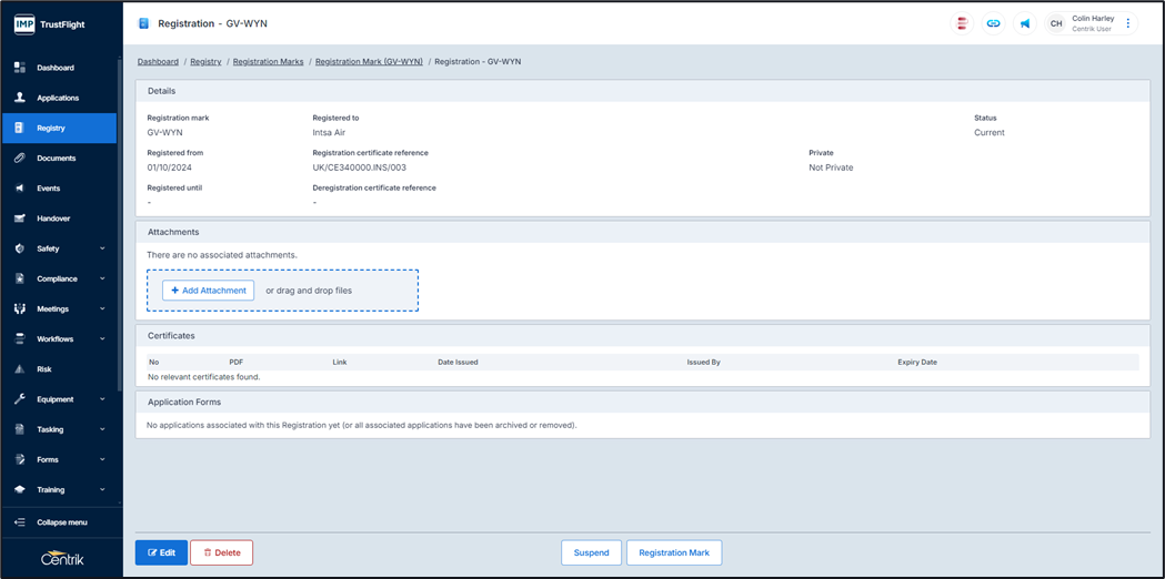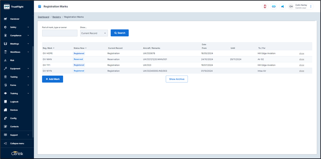 All aircraft that have been registered following this process will be displayed on the Registration Marks page via a summary view.