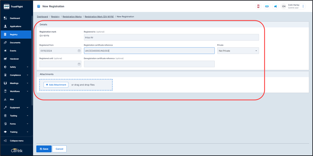7. Enter in the details regarding who the aircraft is registered to (a list of your organisations will be available, if the organisation is not available it will need to be added) alongside a date the registration mark is registered from and its registration certificate reference. Any required attachments can be added on this screen