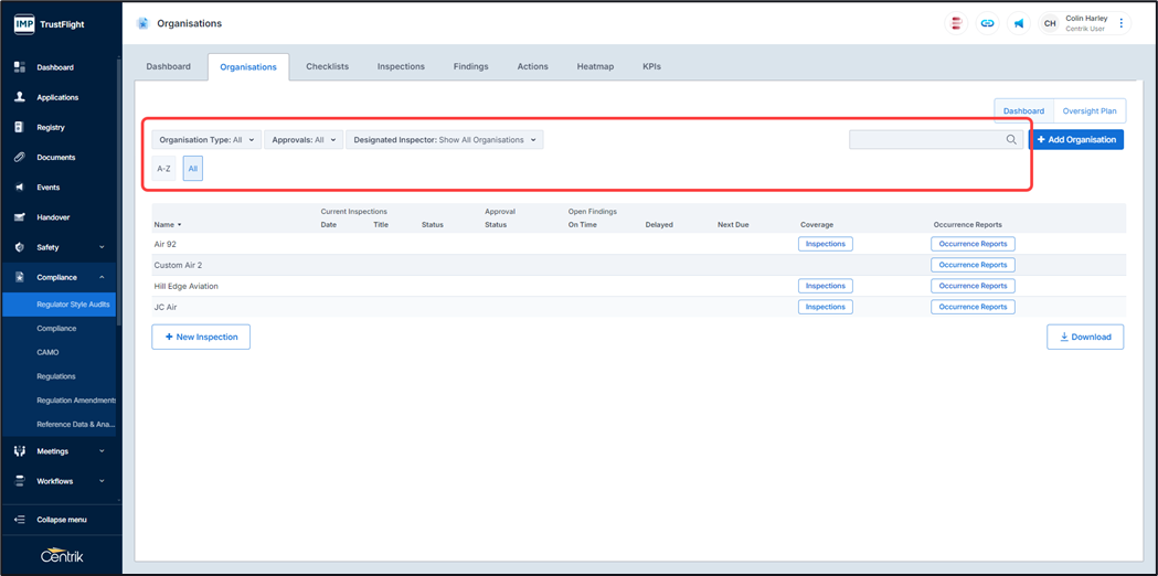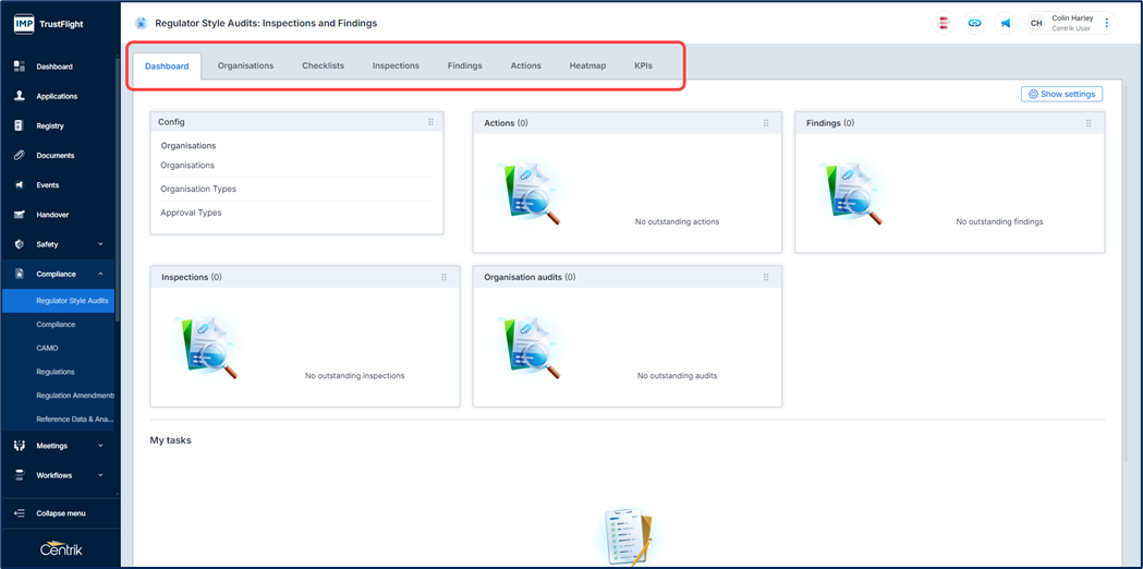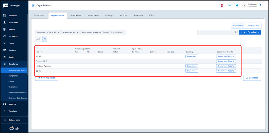 A summary page is displayed providing an organisational overview of current inspections and any open findings alongside a Coverage area (when selected displays the audit checklists that have been used and any regulations that have been audited against) and an Occurrence Reports link (when selected it provides an overview of submitted safety cases).