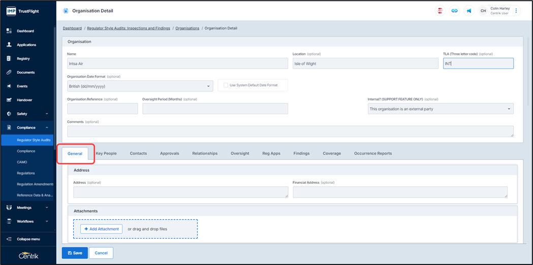 3. Starting on the highlighted ‘General’ tab enter in the information relating to this organisation