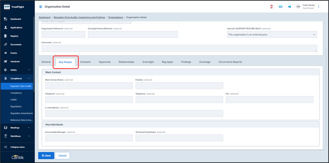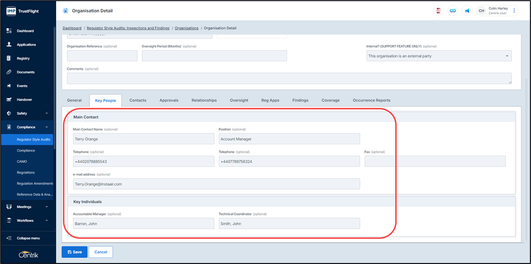 The next step is to enter information relating to key people within that organisation, this could be an Account Manager, a Safety Manager, a Quality / Compliance Manager etc.