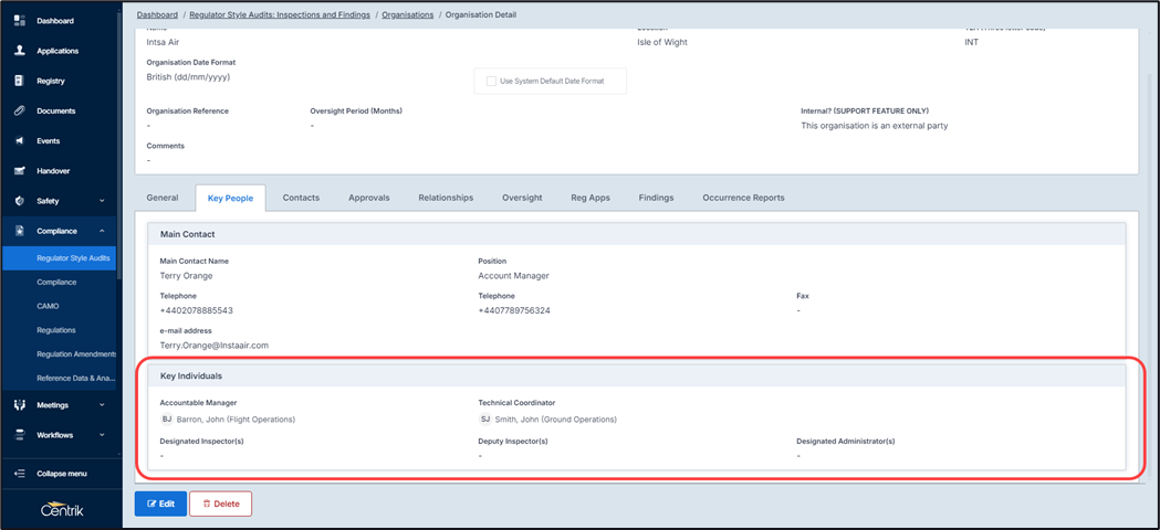 9. Under the Key Individuals area this is the area for the Regulator to enter their team including the Accountable Manager (if there is one) and a Technical Coordinator