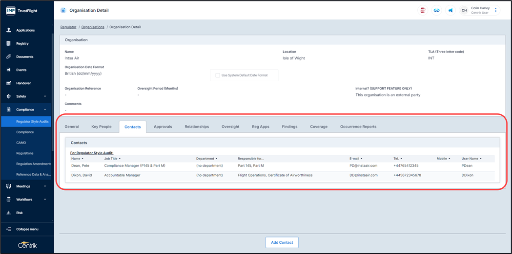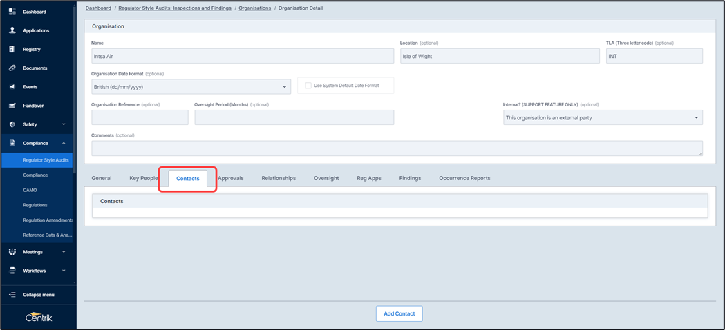 Moving back to the organisation page, and under the contacts tab you can view the details of the newly added contact / user.
