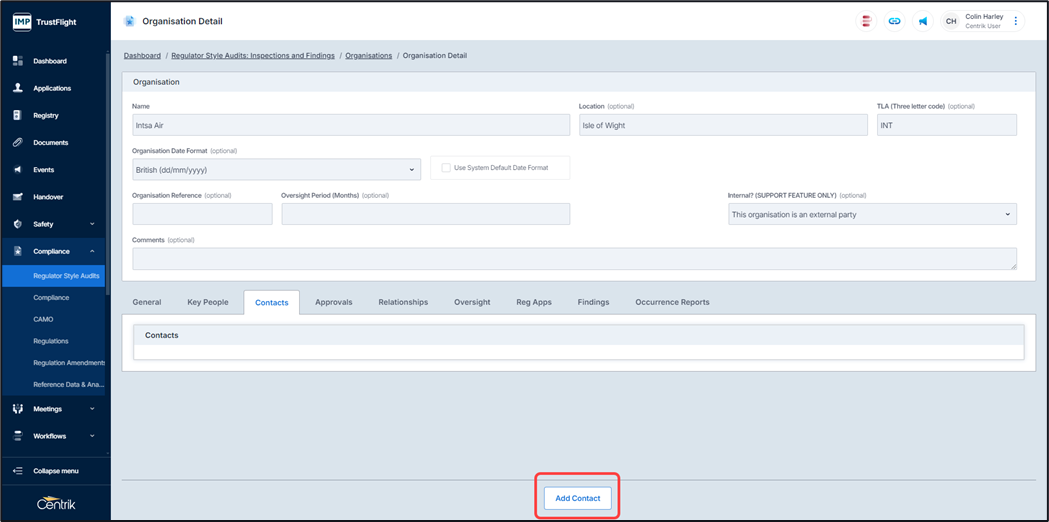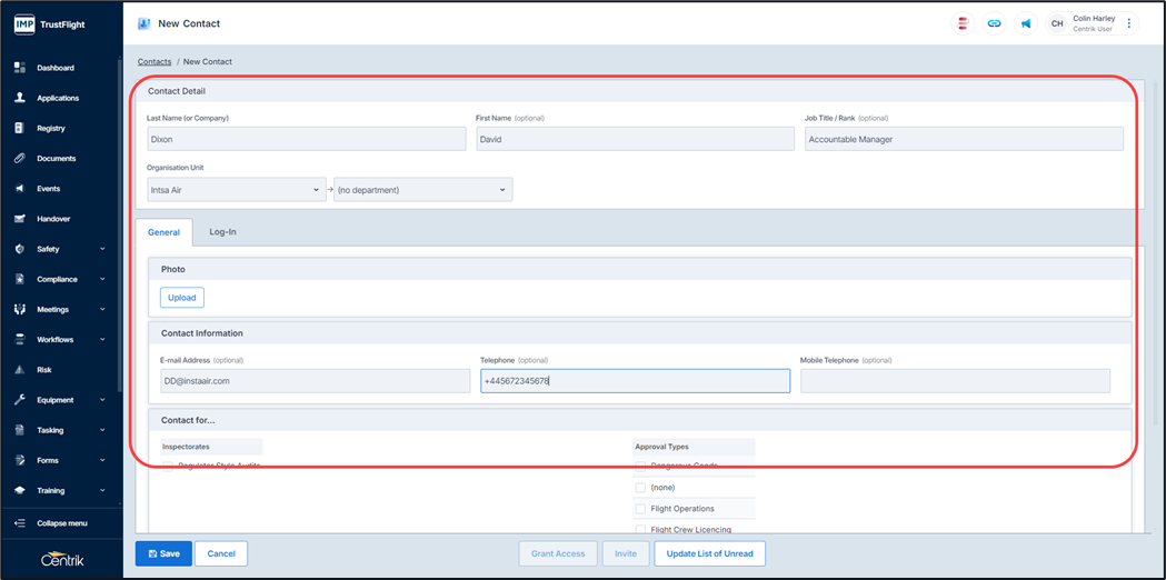 The next step allows you to add a contact to this organisation, a contact will be placed within the Contacts module, they can simply be listed as a contact with no system access, or they can be granted system access once added. As an example, if a finding is raised during an audit this contact can respond with a corrective action plan and root cause analysis directly in Centrik, you can also create Actions and assign them to this user, in turn they will be able to respond within the system.
