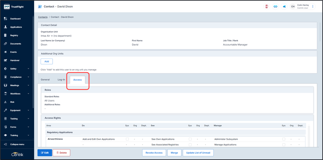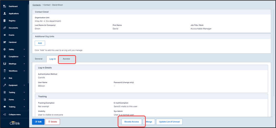 Once saved an additional tab (Access) becomes available alongside the ability to revoke system access for this user, if its required.