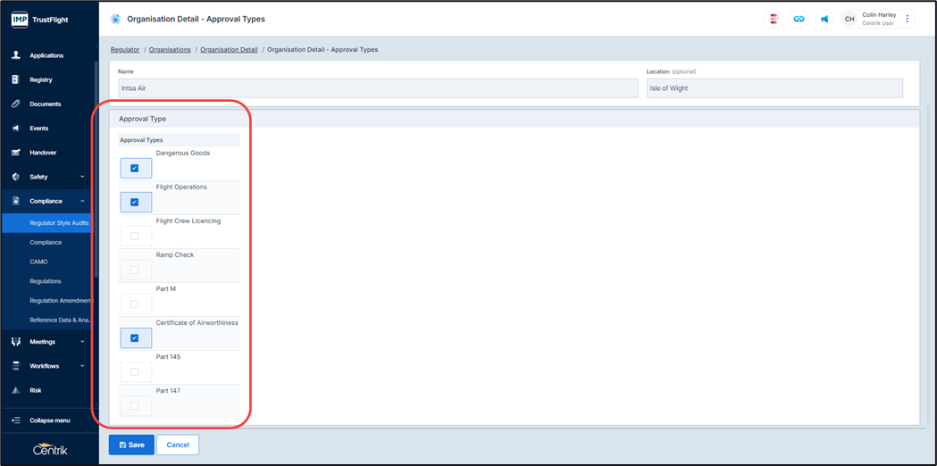 5. Select the Approval Types for this organisation by checking the available checkboxes
