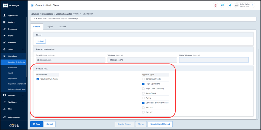 Within the Contact for.. area you can choose which subsystem this contact is responsible for (the example below only has one (Regulator Style audit) and which Approval Types they are responsible for. This means you can have multiple contacts for an organisation who are responsible for different areas of that organisation.