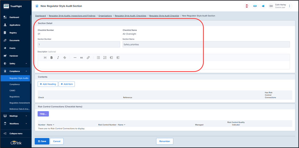 5. The section number is autogenerated but can be overridden, add in a section name alongside a description (if required)