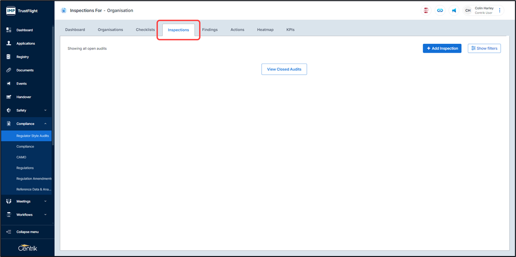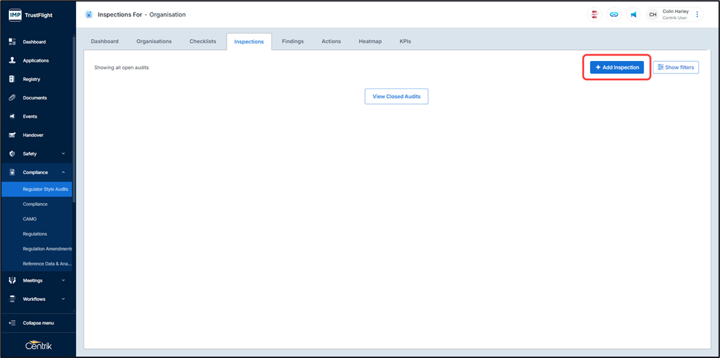 Once organisations and checklists have been added you can move forward by adding in your inspections.
