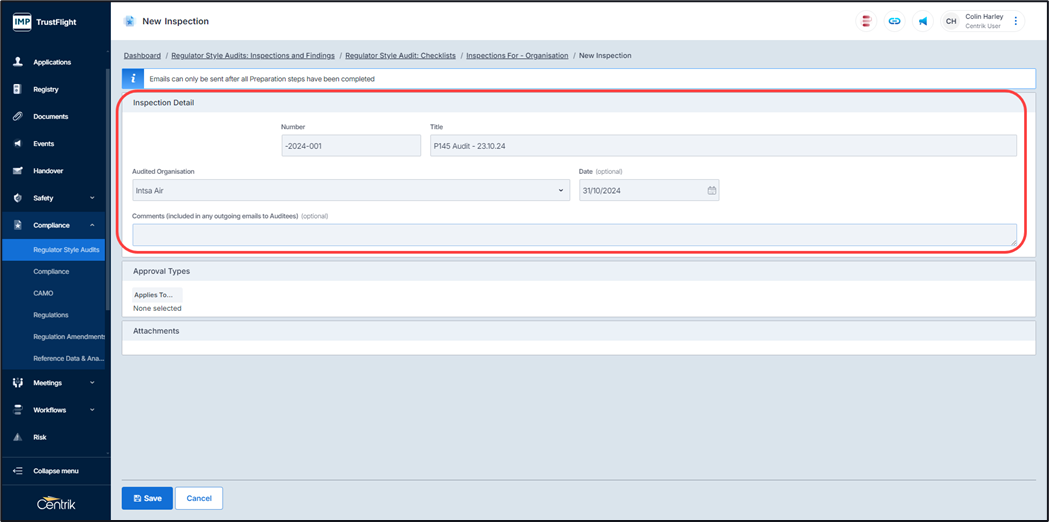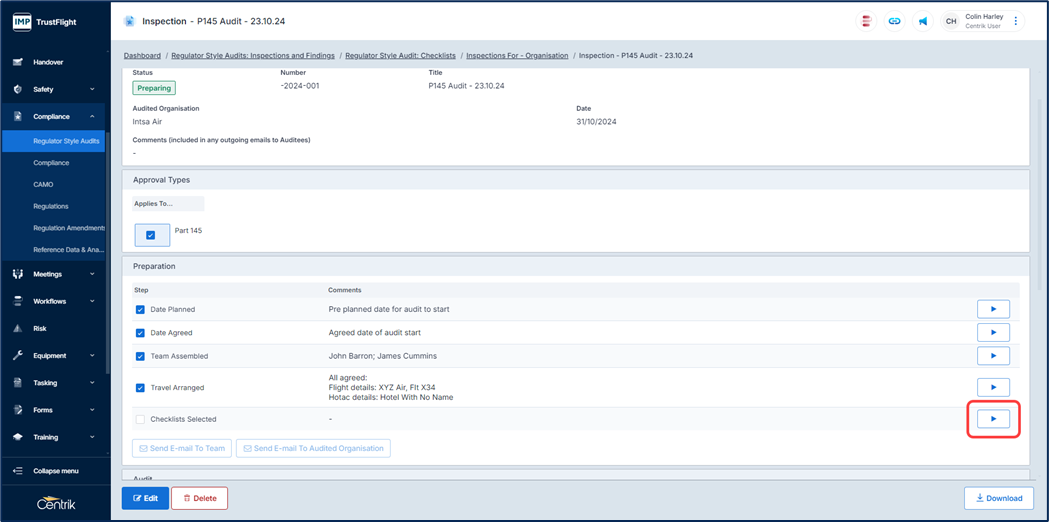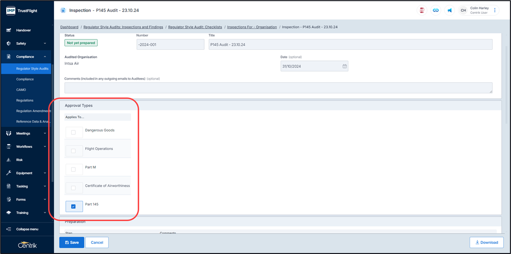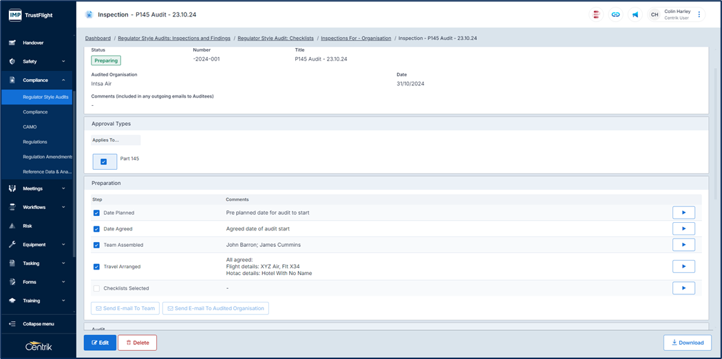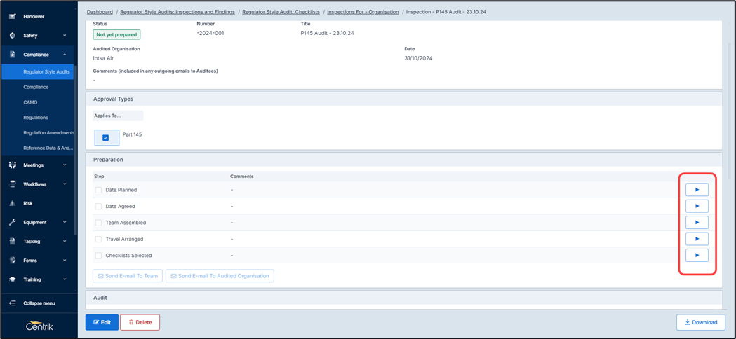 Completion of this displays an overview summary where the audit can be prepared, approval types can be selected, auditors selected, and checklist associated to this audit.