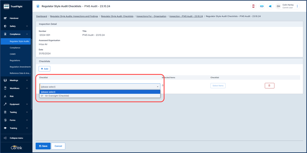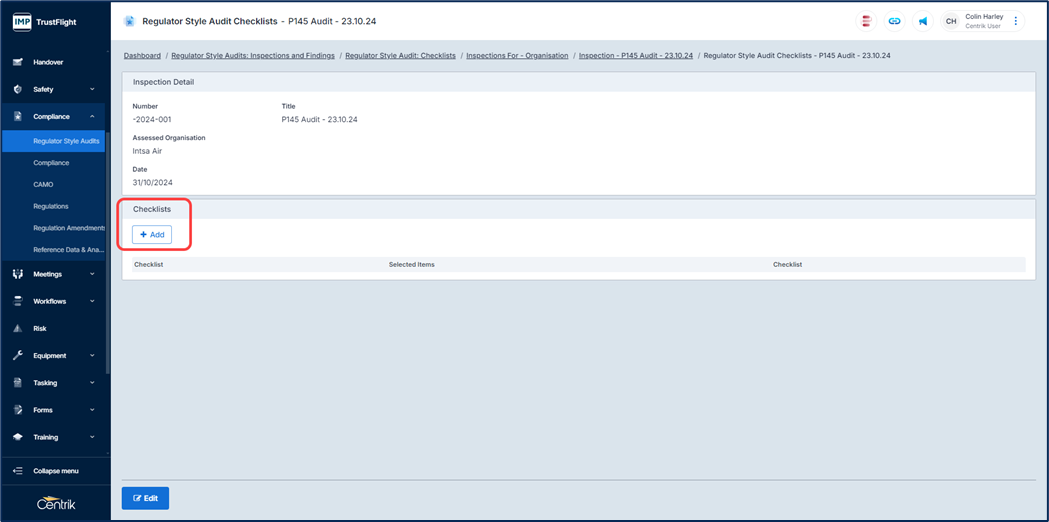 Checklists Selected – The checklist that will be used during the audit, clicking on the ‘Add’ button will allow selection of the checklists to be used