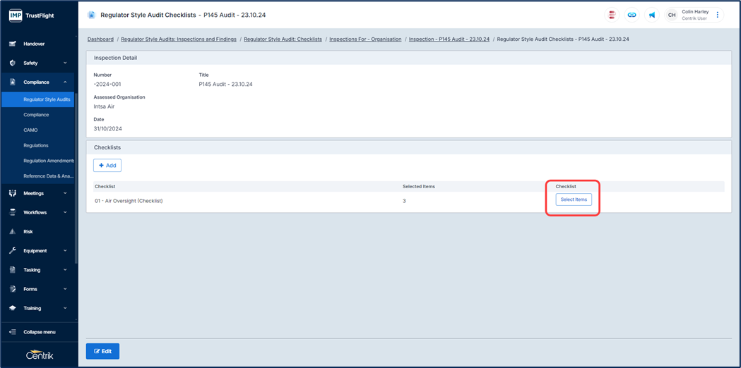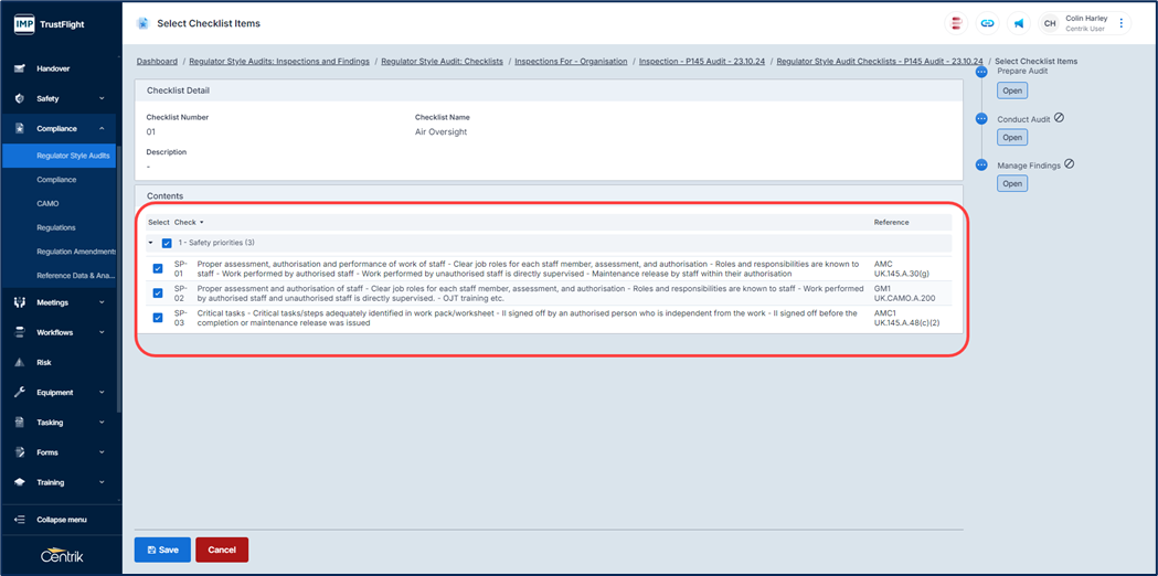 You are able to use the entire checklist (no action is required) or using the ‘Select Items’ button select which parts of the checklist to use