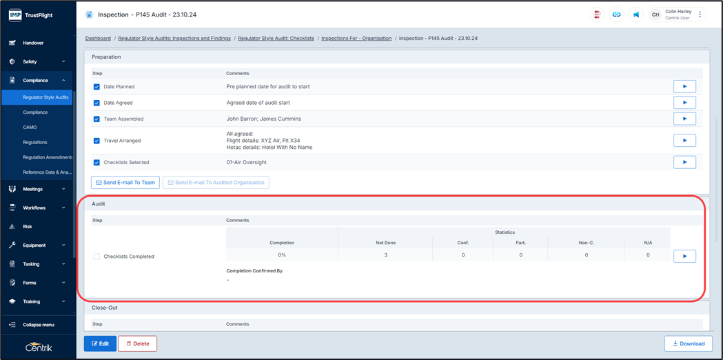 Any individuals listed as carrying out the audit will be notified via email and through Centrik.