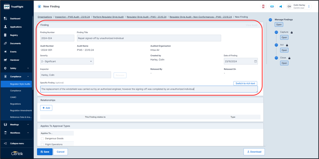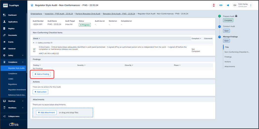2. Any non-conformance items will require a finding associated to them, click on the ‘Add Finding’ button