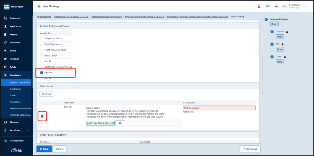 7. Select the check box of the failed item / finding / non-conformance