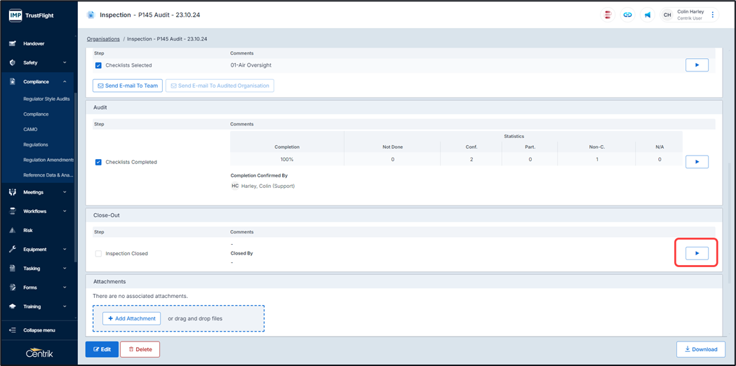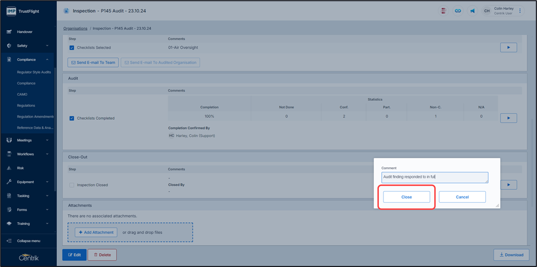 The final step is to close out the audit from the inspections tab.