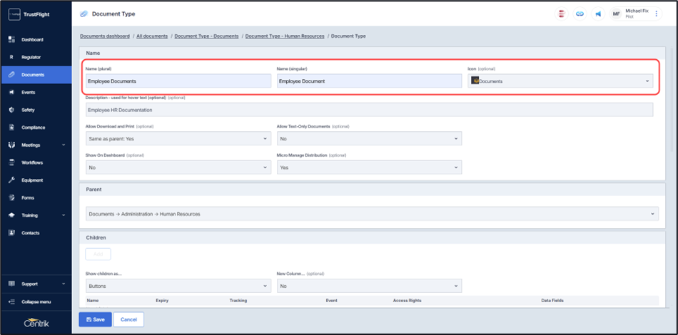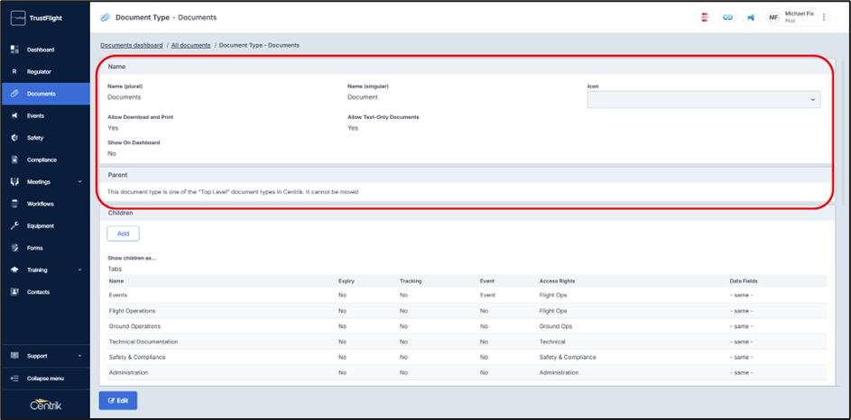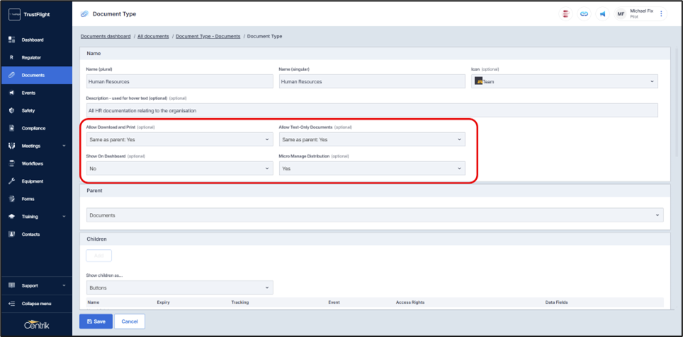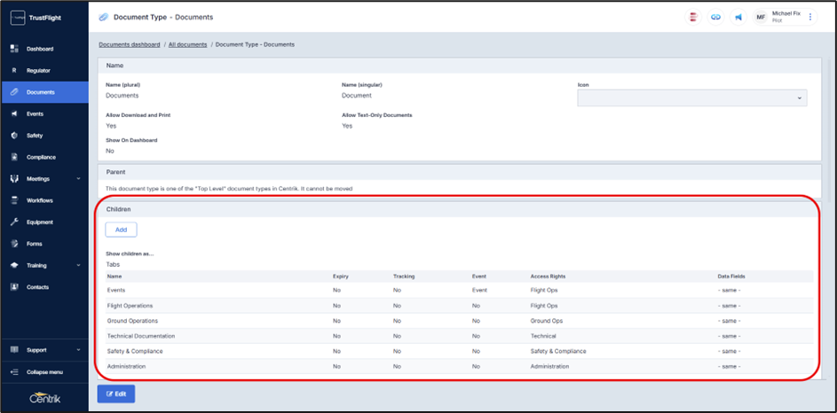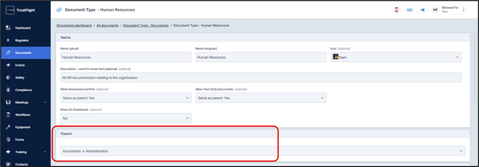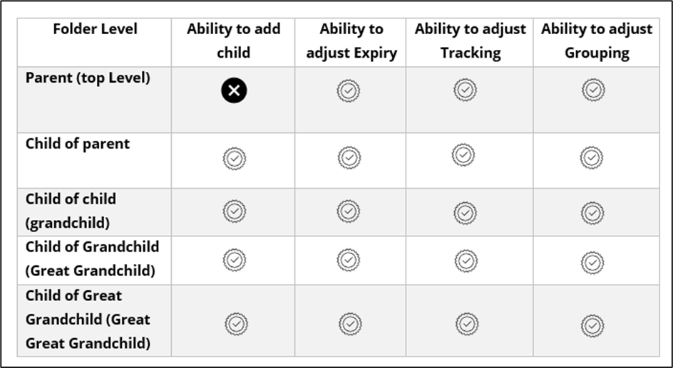 The structure works on a Parent child basis, the displayed screen is the ‘Top level’, child folders at this level can / should only be created by the TrustFlight Support team.