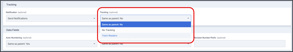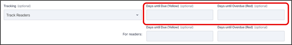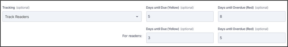 If Tracking is set to yes, additional fields are displayed allowing you to set numerical values for when this document is Due, or Overdue, settings for Admins can be set as well as settings for readers.