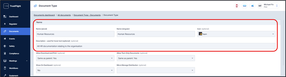 The Title Value naming can be adjusted, if required and Types entered via the ‘Manage Types’ area within each document folder.
