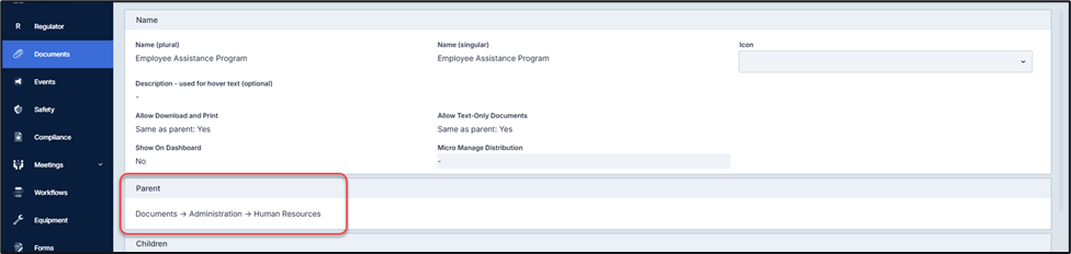 The Parent area allows you to view the parent group of this folder, the full pathway to our Top Level (Documents) is displayed.