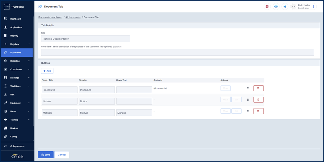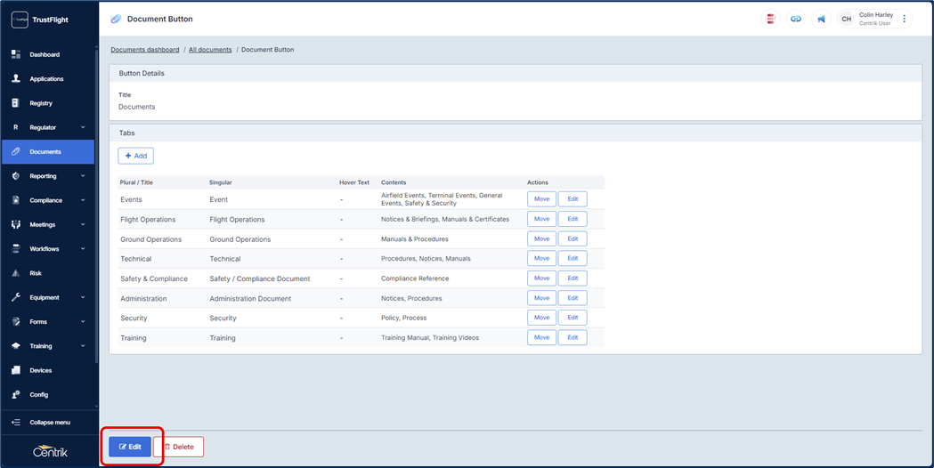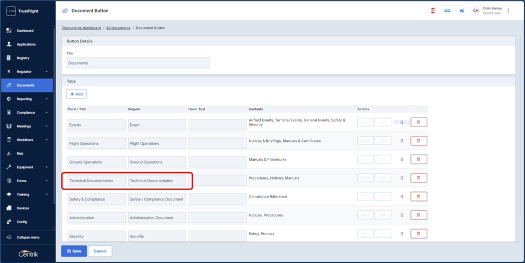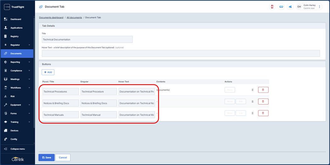 Moving back to the main documents page the button naming has been altered and the hover text added.