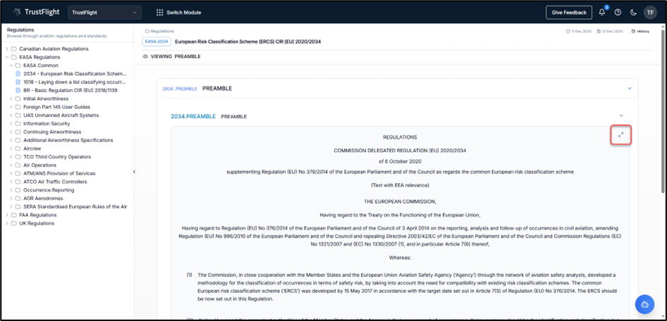 - A History button that lets users see the source document for the chosen regulation.