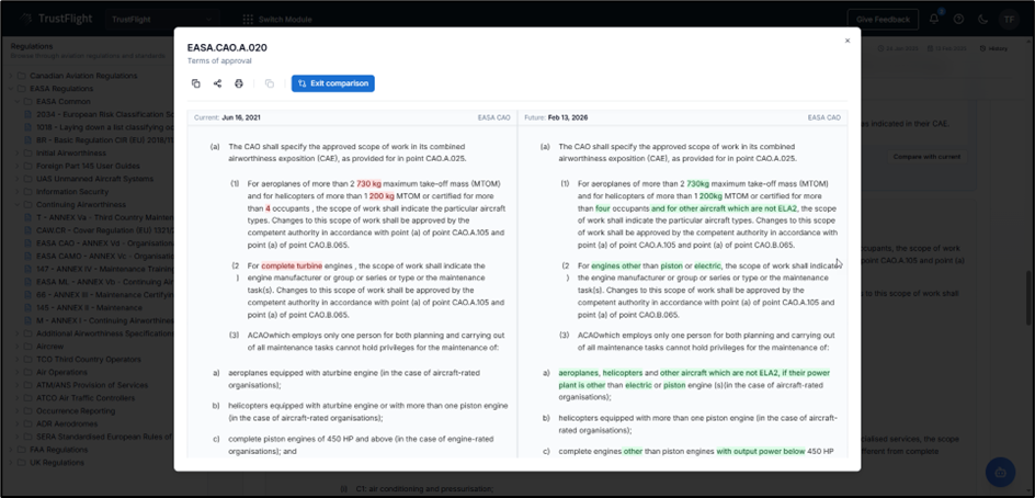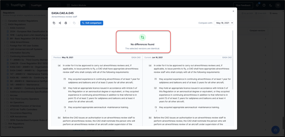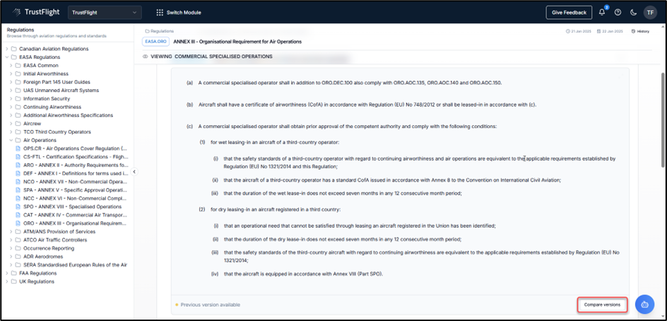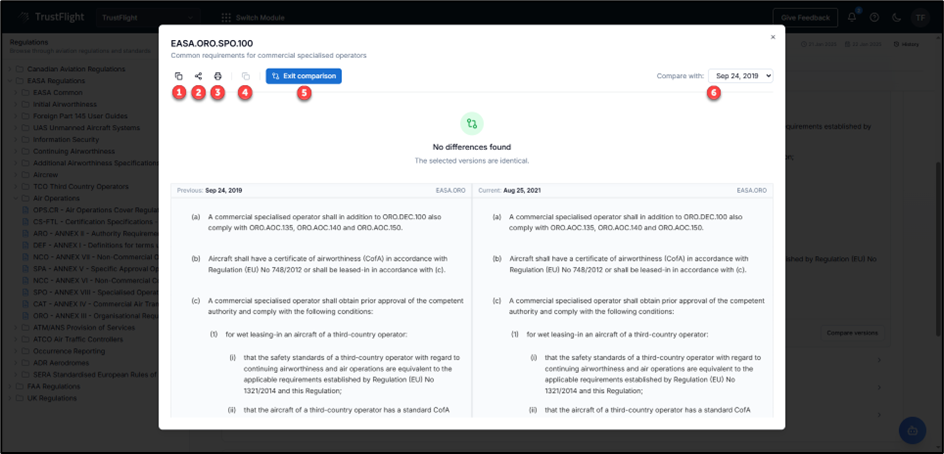 - Change version being compared – a drop-down allowing users to select different previous versions of the regulation.