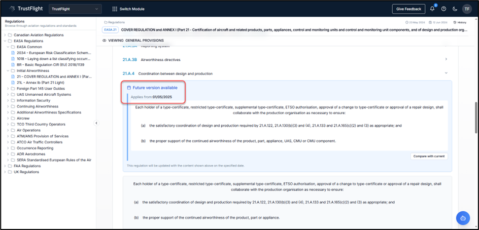 Users will clearly see when regulation items have a future version available, along with guidance text explaining that the regulation will be updated automatically.
