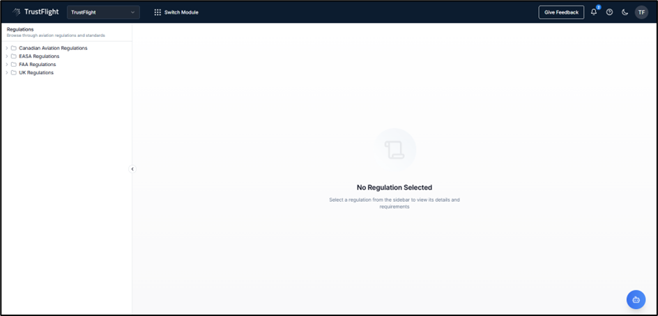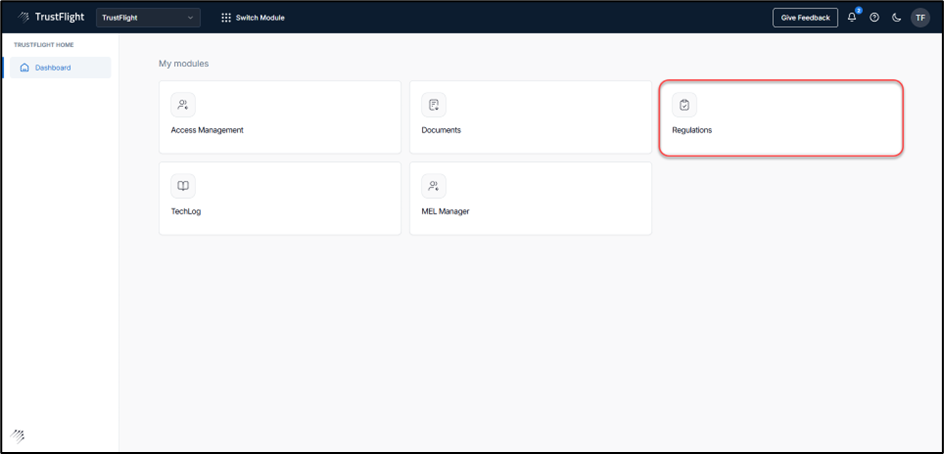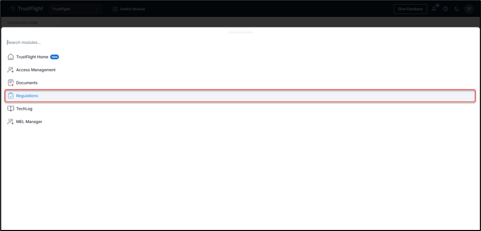 Or by clicking the Switch Module icon and then selecting Regulations:
