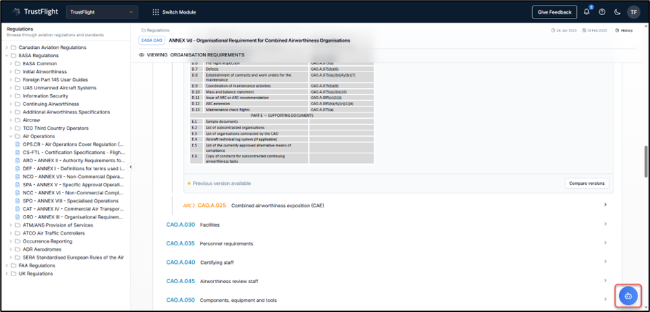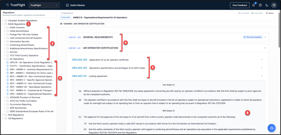 Regulations governed by organisations like EASA (European Union Aviation Safety Agency), SMR (San Marino Aircraft Registry), the FAA (Federal Aviation Administration) and the UK CAA (United Kingdom Civil Aviation Authority) each have their own way of publishing regulations and compliance guidelines. The SmartSuite platform has standardised these Regulations into a common format, making them easy to find and view.