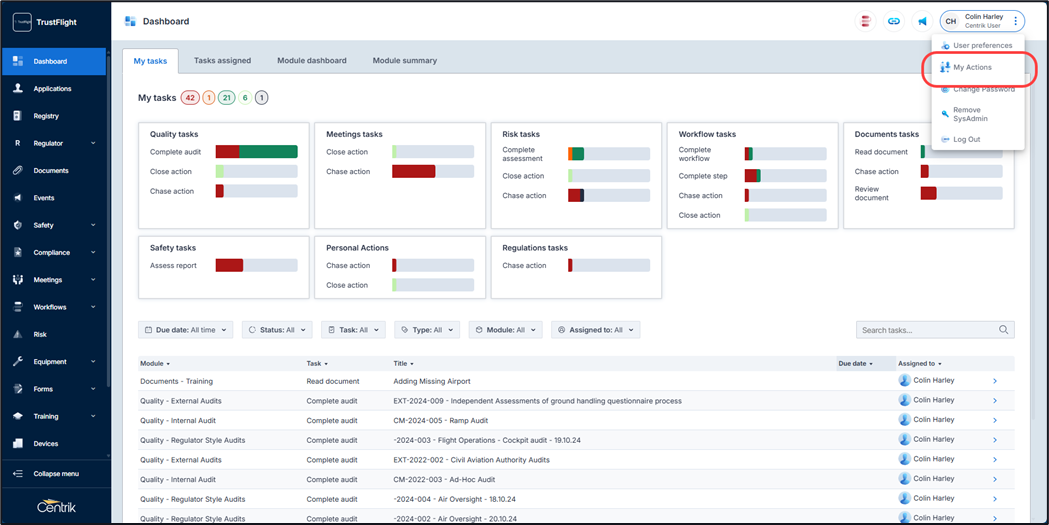 To access this area click on the three dots next to the signed in user, this will display a list of available options. One of these options is titled ‘My Actions’.
