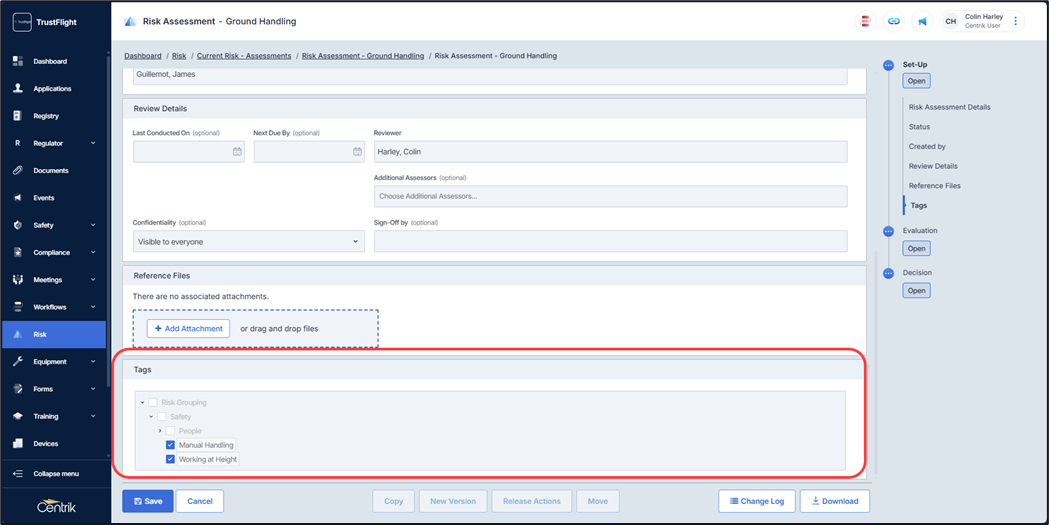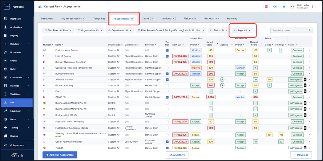 Centrik can facilitate the creation of tags within each Centrik site (this is a configuration option). Tagging is used extensively throughout aviation to support policy, processes, legislation, regulation, and procedures.