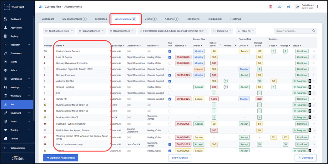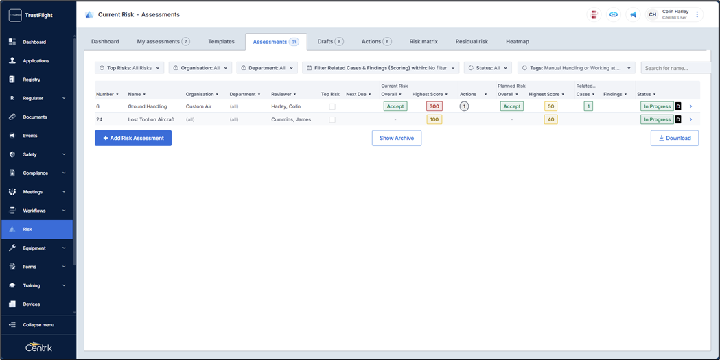 The relevant risk assessments linked by the tagged hierarchies are displayed.