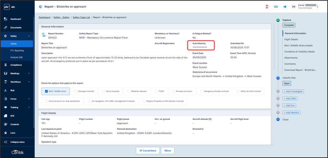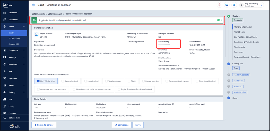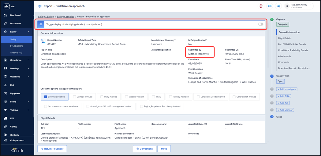When reviewing a safety case you are able to hide (toggle) sensitive identifying information related to the submitted report, this includes the name of the person submitting the report and the aircraft registration.