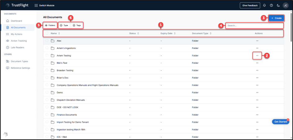 1 - Columns: The list of folders and documents is organised by several columns (Name, Status, Expiry Date, Document Type and Actions), providing a structured way to display items.