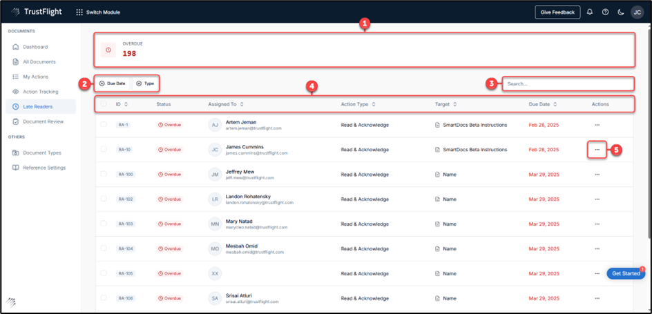 4 - Columns: The list of overdue items is organised into several columns (ID, Status, Assigned To, Action Type, Target, Due Date and Actions).