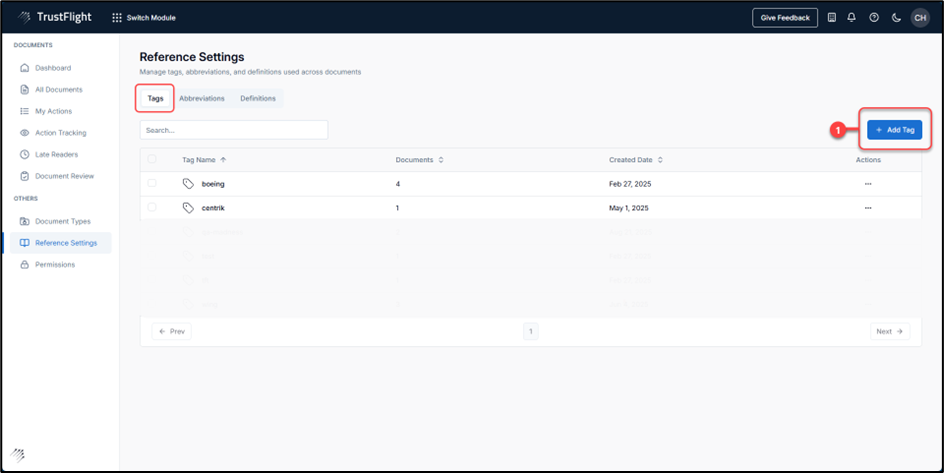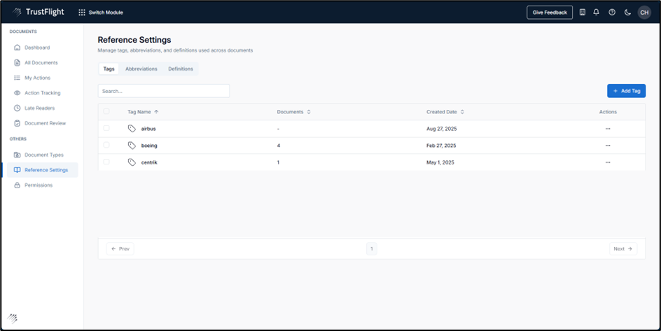 Tags are managed within the Reference Settings section, by selecting the option from the side menu and clicking on the Tags Tab. This view displays an overview of the current system Tags.