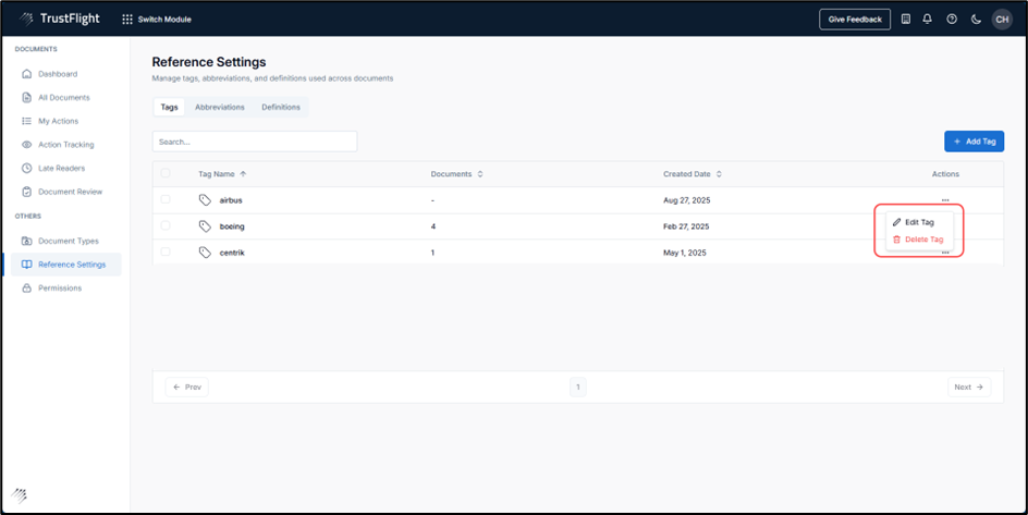 The Columns display the created Tag Name, the number of Documents that are linked, or associated to that specific Tag, the Created Date (when the Tag was created), and an Actions section, this allows you to edit or delete the created Tag.